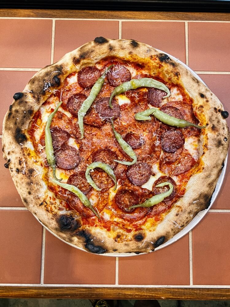 Spicy tomato base , hot sopressa salami, hot italian sausage, chilli oil, guindillas chilli